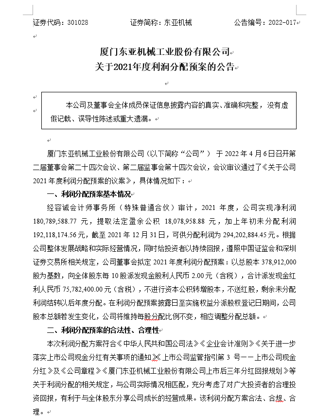 关于2021年度利润分配预案的公告
