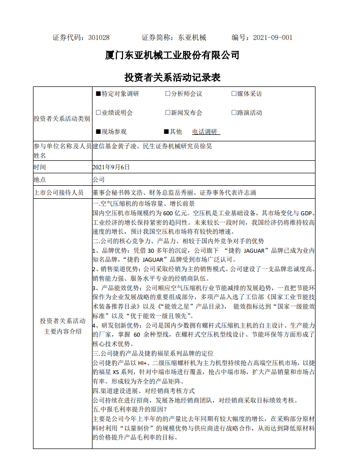 2021年9月6日投资者关系活动记录表
