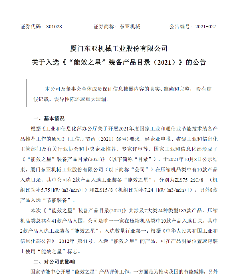 关于入选《“能效之星”装备产品目录(2021)》的公告