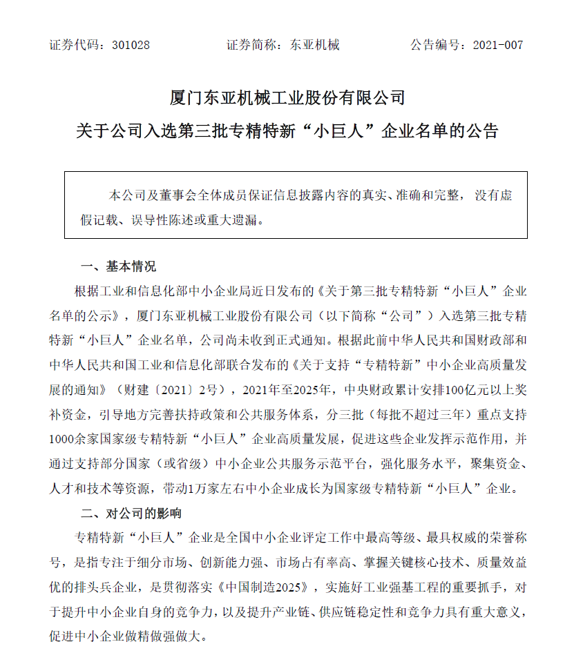 关于公司入选第三批专精特新“小巨人”企业名单的公告