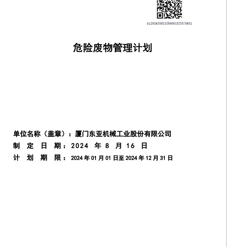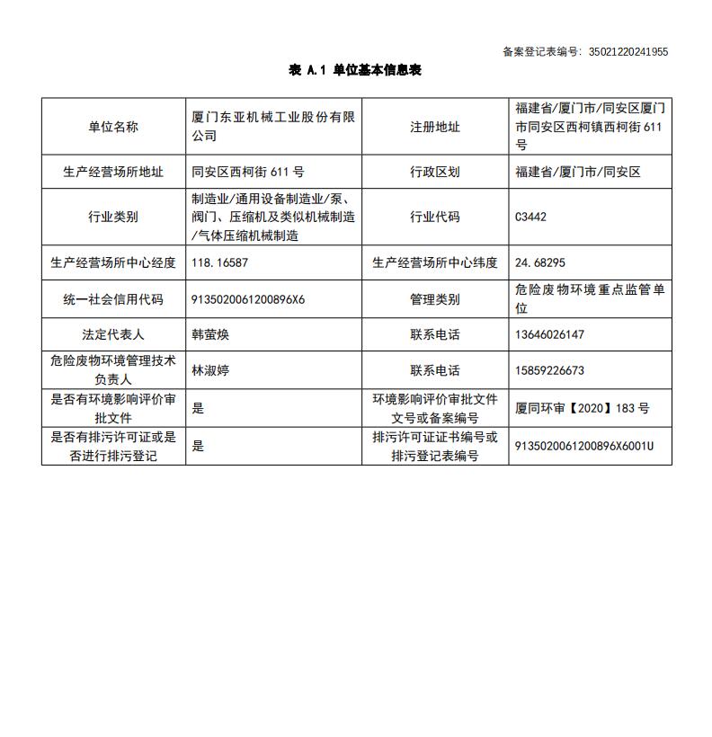 厦门东亚机械工业股份有限公司 环境保护信息公开表