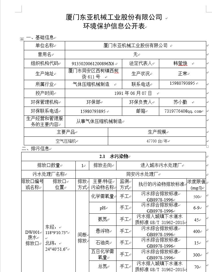 厦门东亚机械工业股份有限公司 环境保护信息公开表